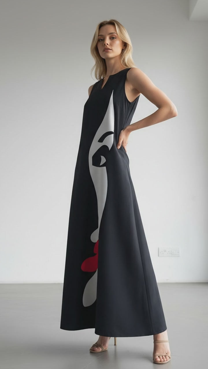 Crafted from lightweight, smooth fabric, the dress drapes beautifully over the body, creating an elegant and effortless look. The sleeveless cut and clean neckline give it a contemporary feel, while the artistic graphic adds a gallery-inspired touch that makes it truly unforgettable.